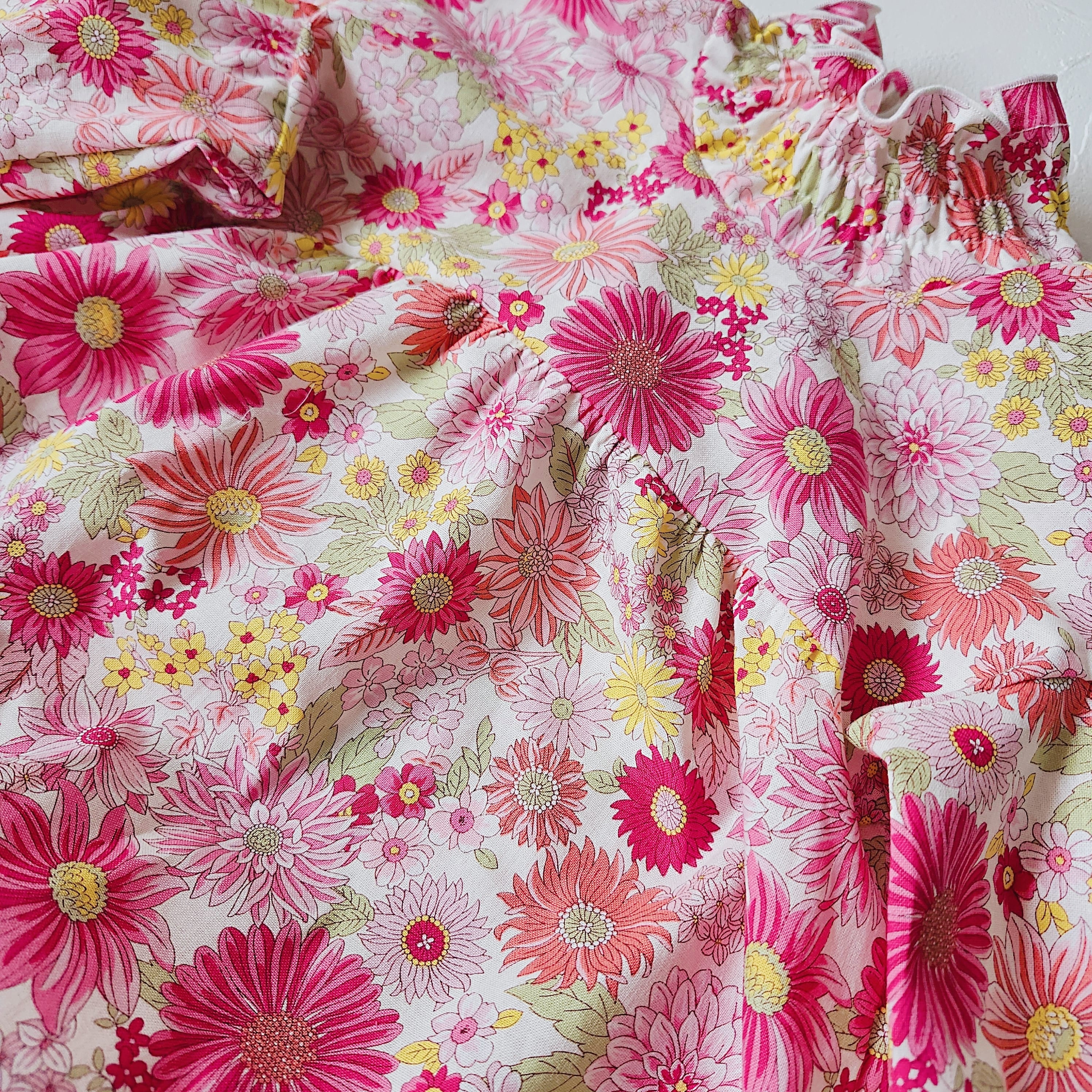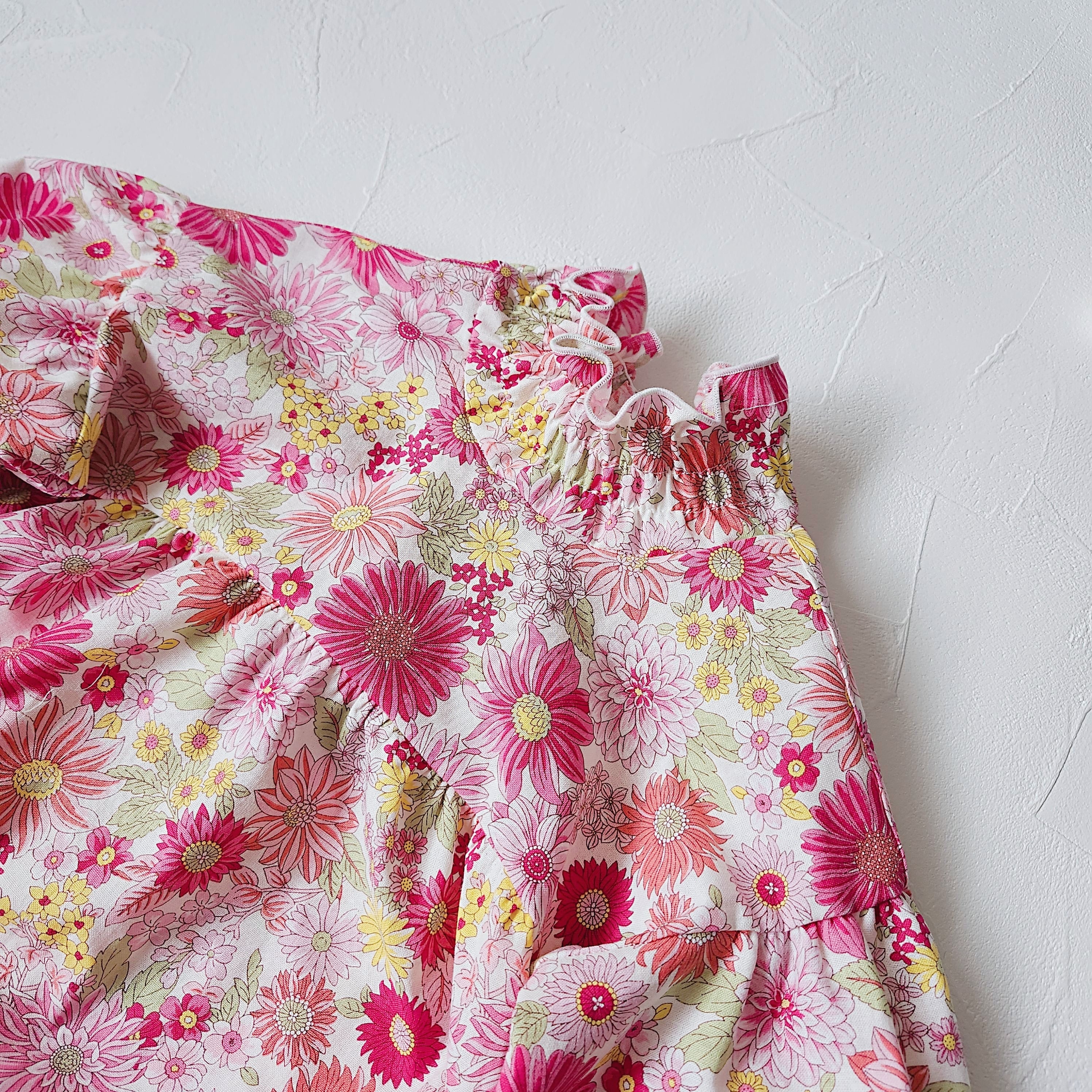 爽やかなブルーの花柄が可愛いふんわりシルエットのロンパースです。